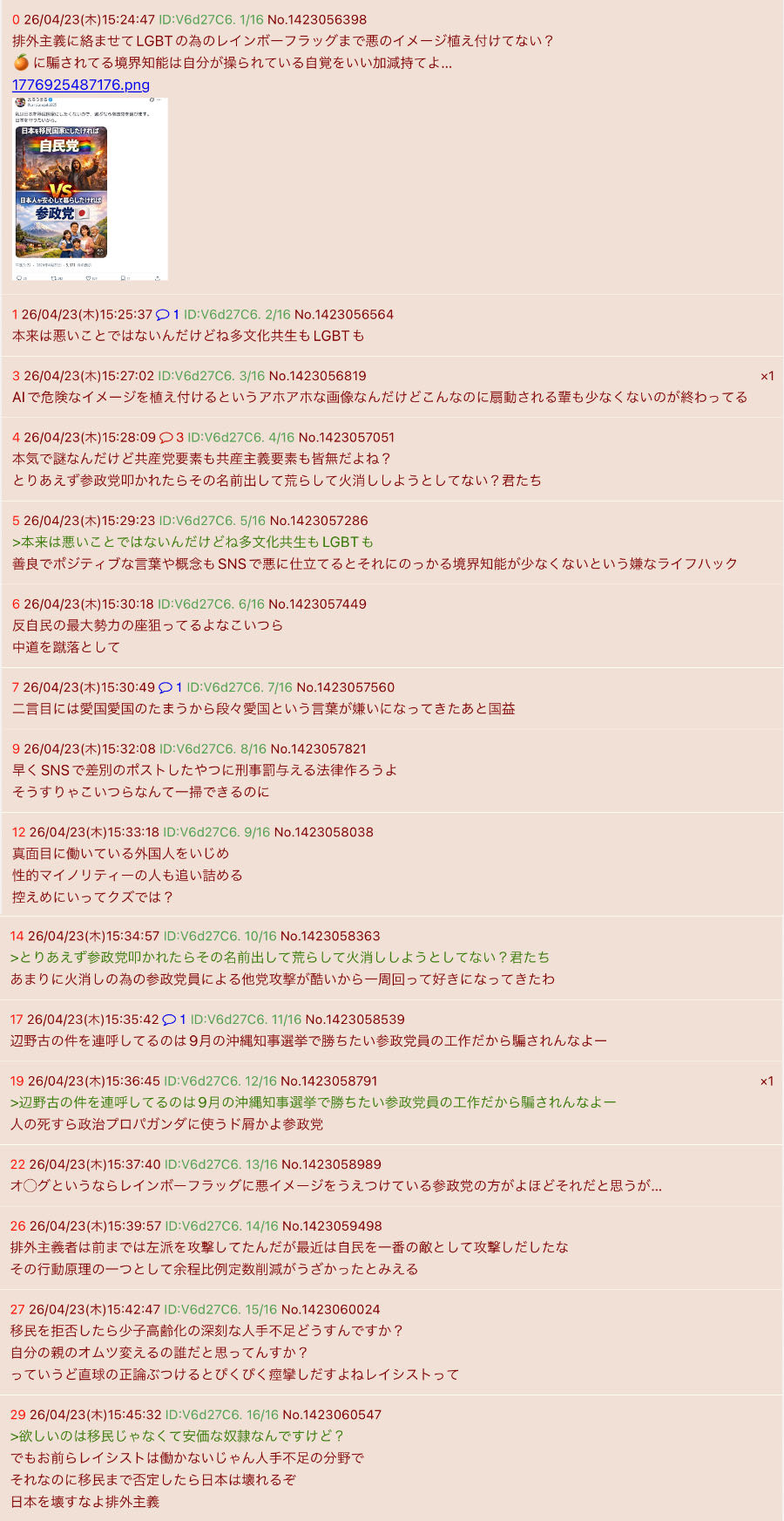| … | 2226/04/23(木)15:37:40 ID:V6d27C6.No.1423058989+オ◯グというならレインボーフラッグに悪イメージをうえつけている参政党の方がよほどそれだと思うが… |