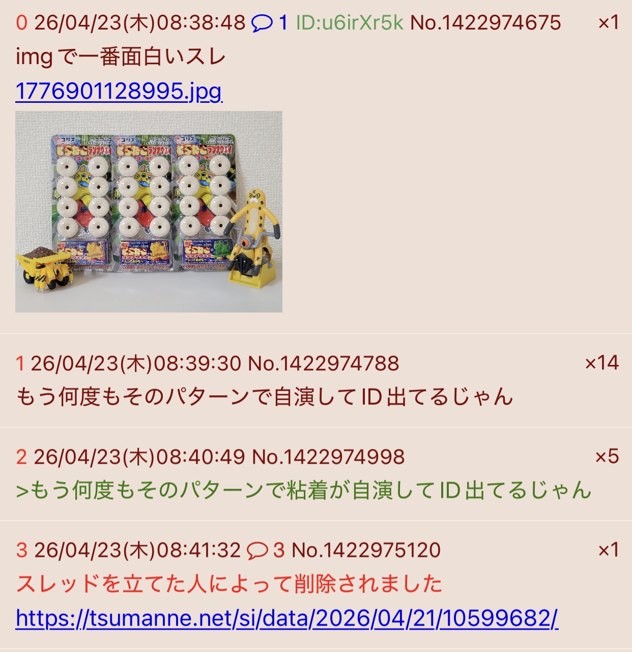 | … | 5026/04/23(木)17:32:31 ID:3WUSJELsNo.1423081349そうだねx1>ふたばが出来た頃から荒らしてるくせにキチガイ三連レインボーマンを知らない? |