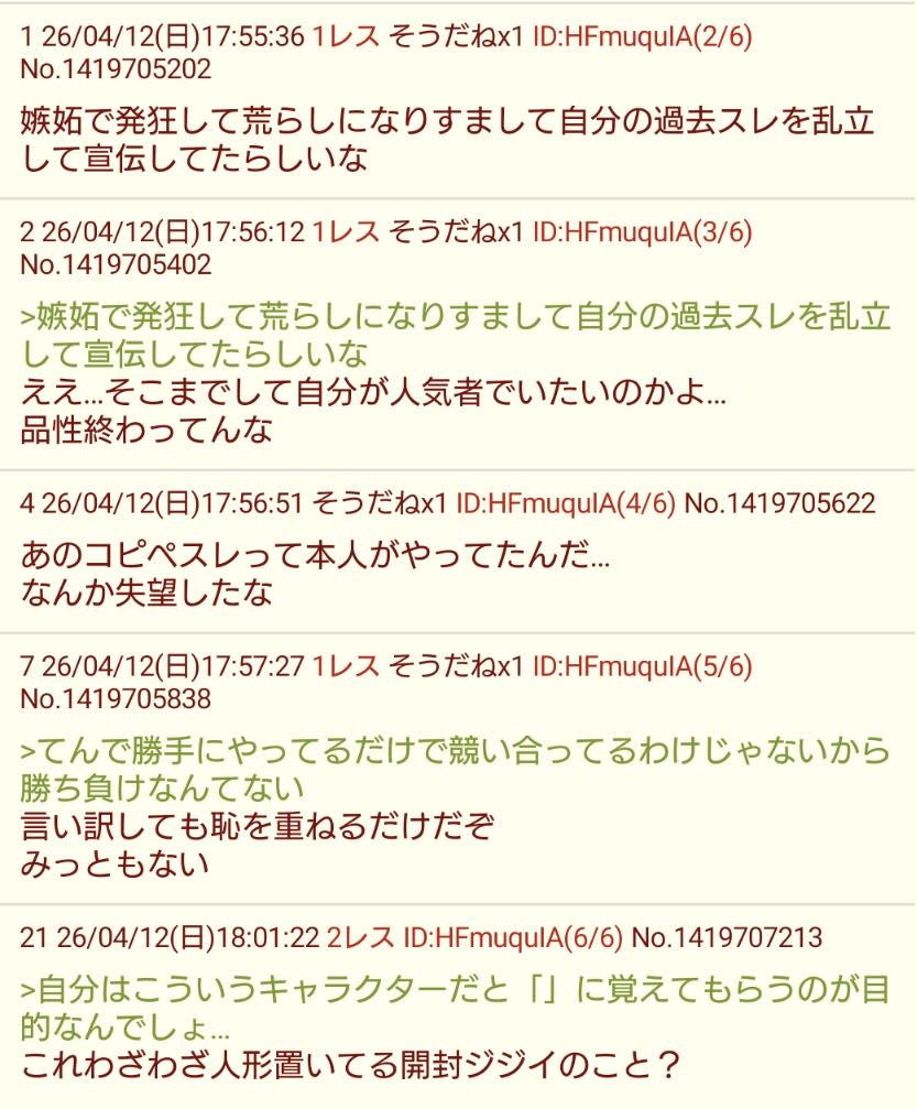 | … | 6526/04/23(木)17:40:54No.1423083320そうだねx2お前がふたばの気に入らないスレをを完全に荒らしきることがあり得たとしても |