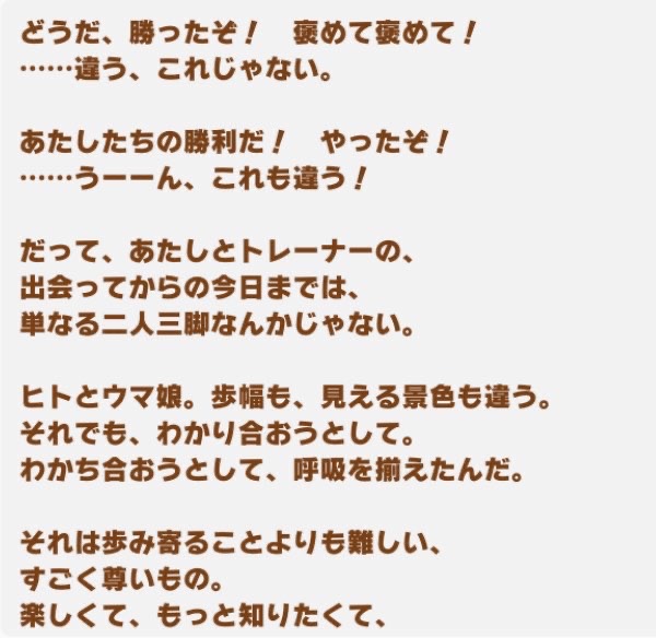 | … | 7526/04/23(木)17:54:22No.1423086638+たまには自分のことを人間と認識して誇りを持ってるウマ娘が見たい |
