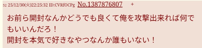 | … | 5726/04/23(木)20:50:41No.1423146192+一日中発狂してるじゃん 親に正論言われたの? |