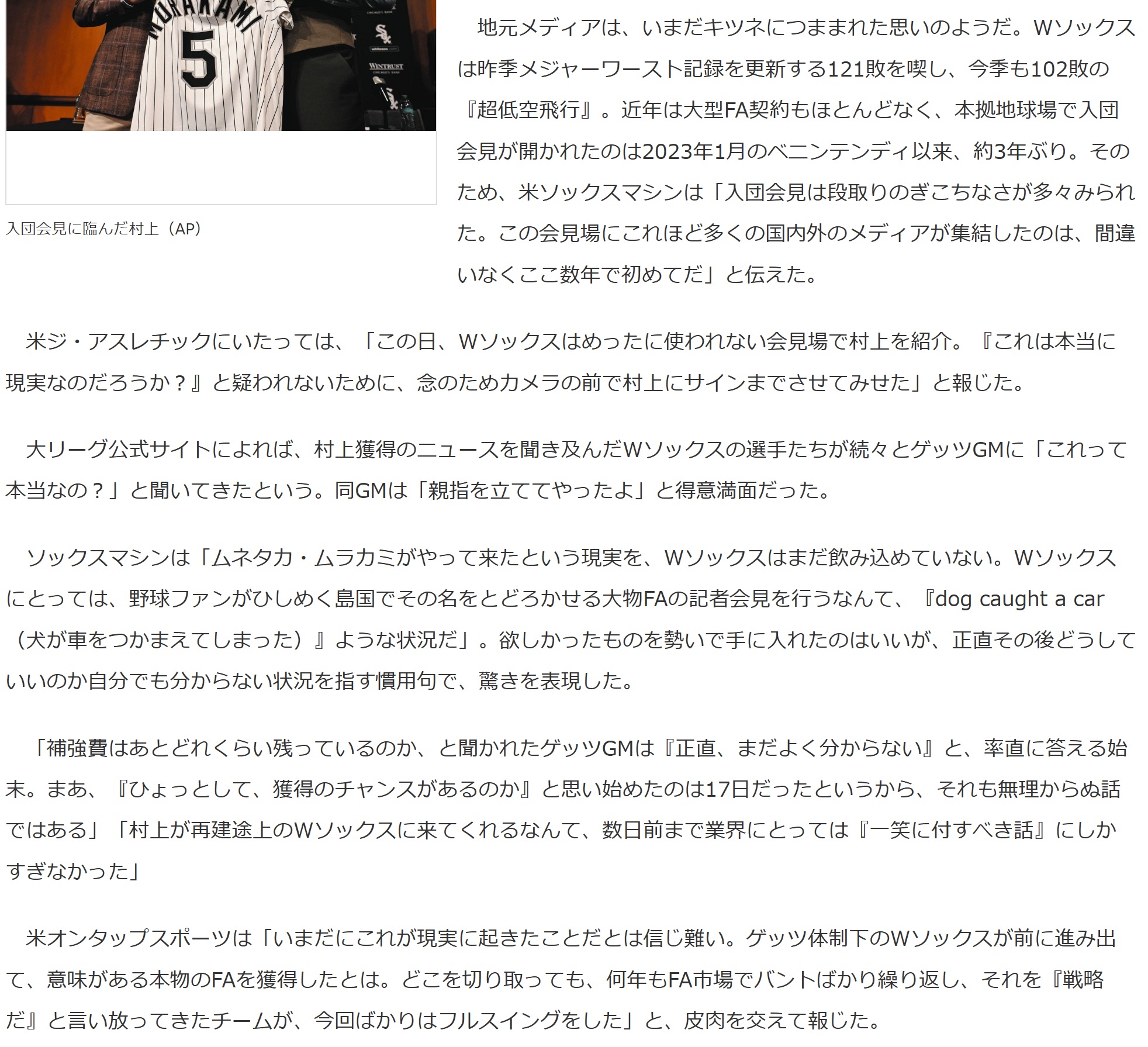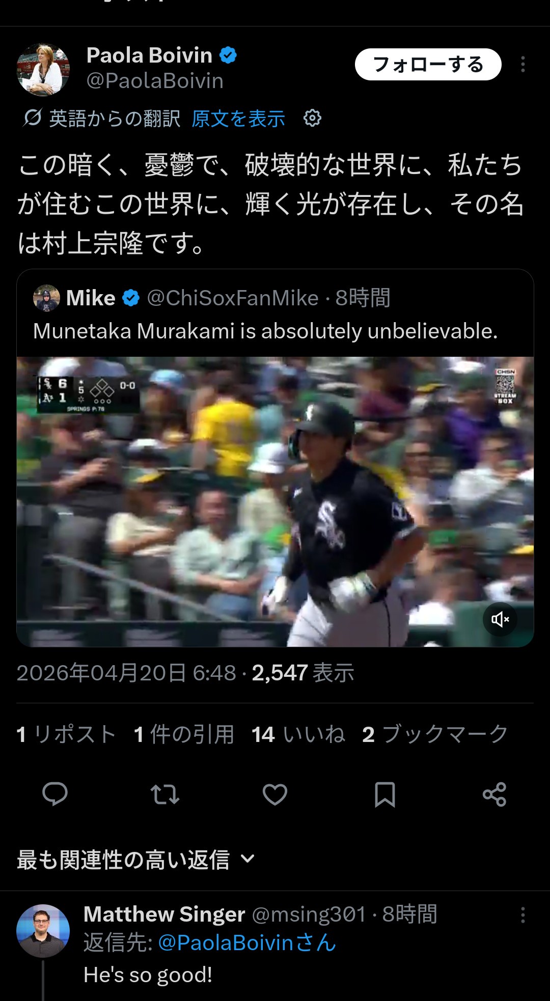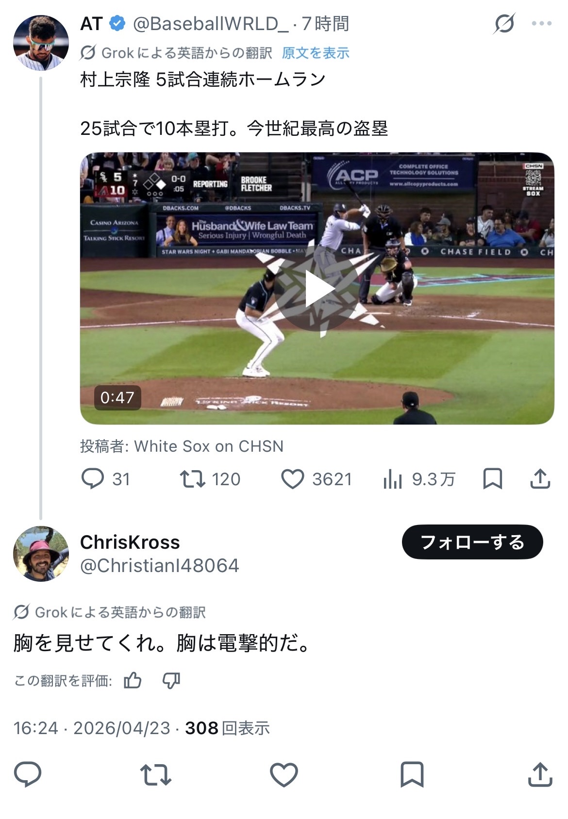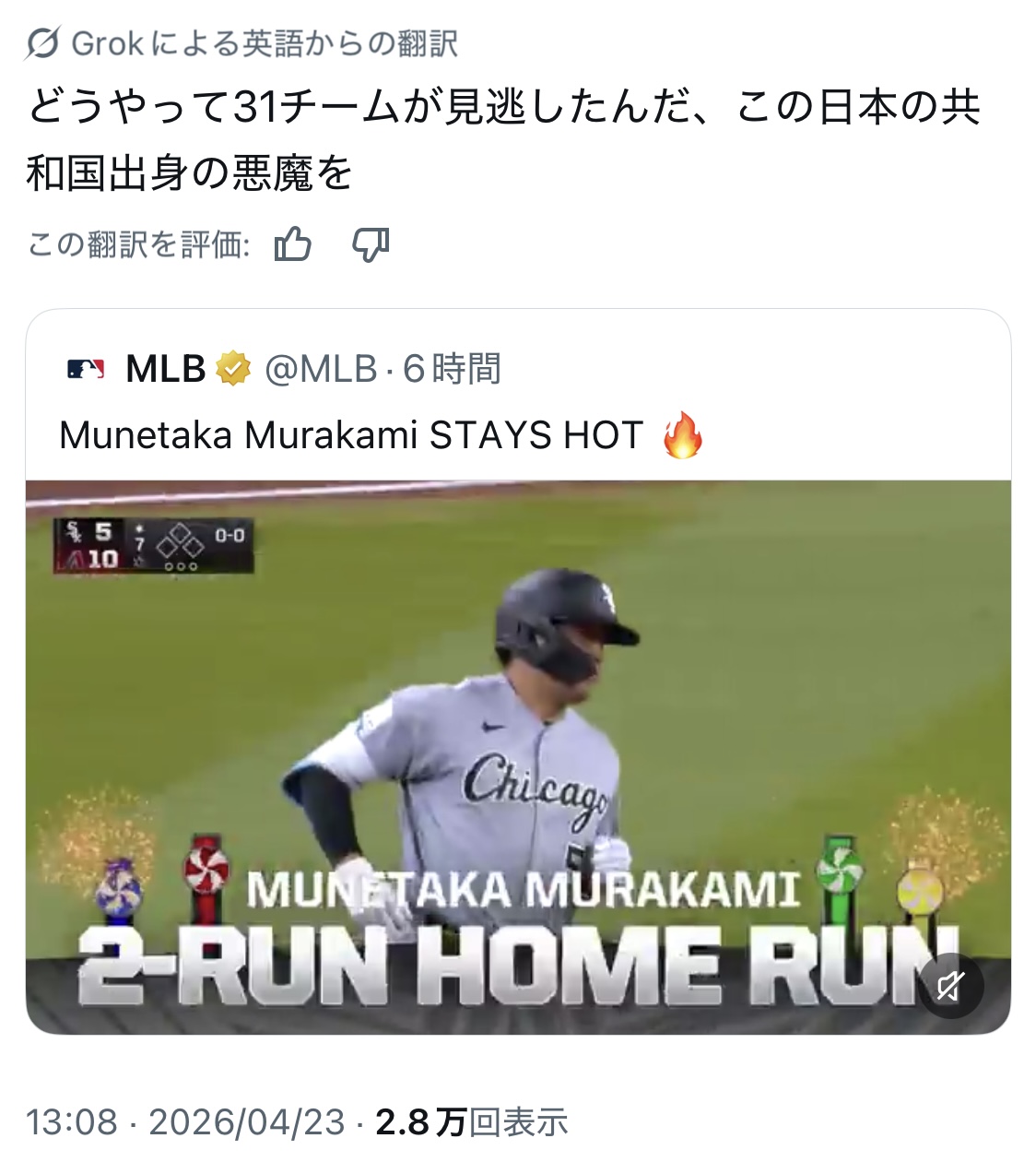 | … | 30026/04/23(木)23:05:16No.1423194021そうだねx7>本来ならホワイトソックスって夢も希望もないところだったんだろ |