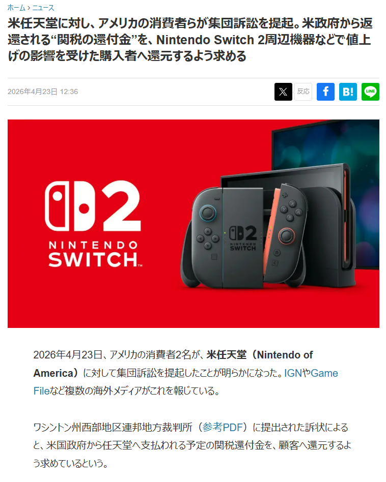 | … | 2726/04/23(木)22:29:04No.1423181731そうだねx1>任天堂アメリカが関税を理由に値上げして関税の還付金を貰ったからその分返してねって至極全うでは |