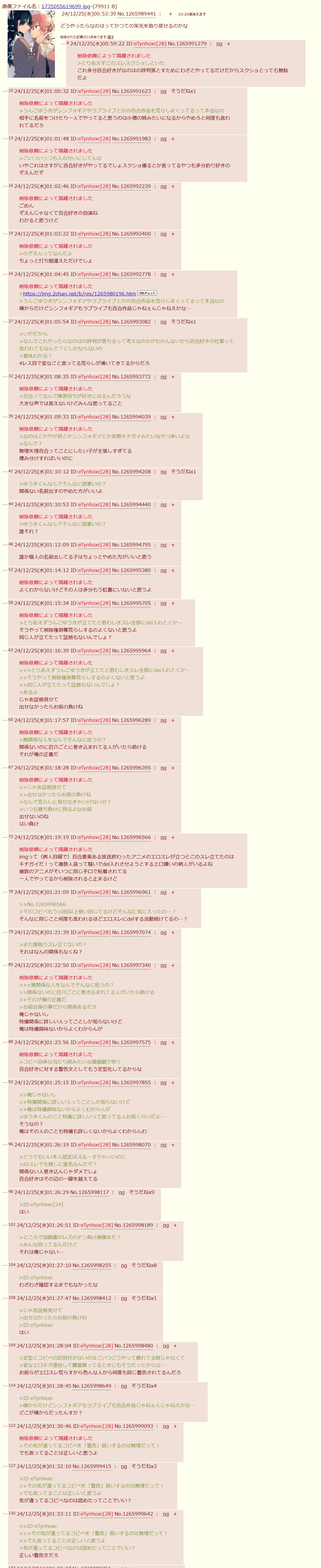 | … | 6326/04/24(金)03:39:12No.1423241799そうだねx5百合系で変なスレ立ってたらこいつが暴れ始める兆候だからわかりやすい |