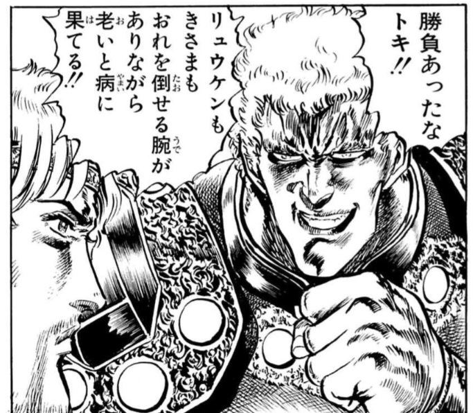 | … | 9226/04/24(金)08:14:04No.1423255962+トキが両手突きを放ってきたのをギリギリで受けて「つ…強い…!!」とか思っちゃうからなラオウ |
