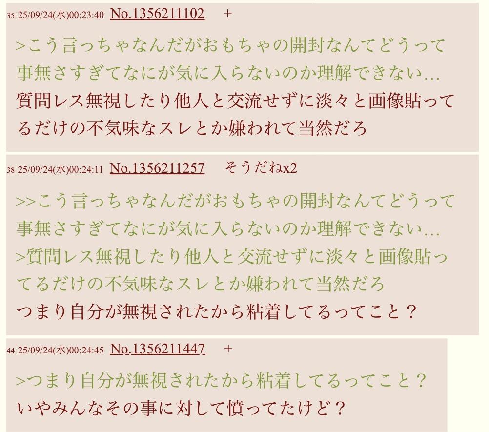 | … | 3426/04/24(金)09:34:04No.1423267441そうだねx2おもちゃ開封なんてめっちゃ個人的なスレに粘着して何もできずにこうやって自分でスレ立ててバカにされるの情けなさすぎる |