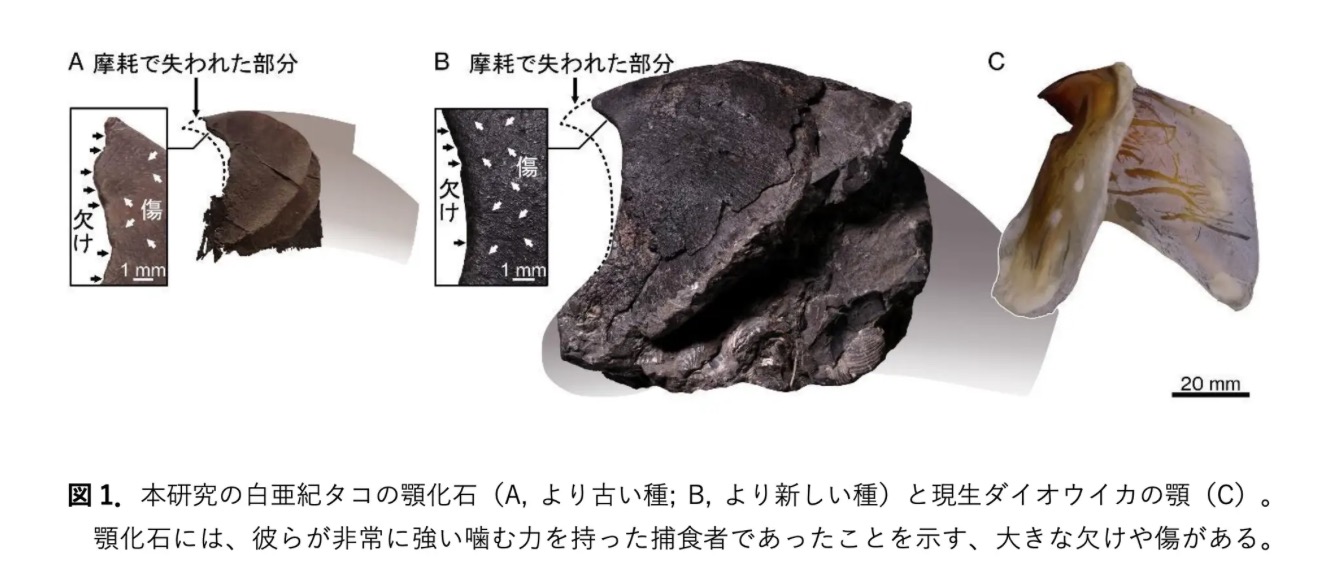 タコのくちばしを構成する大きな顎の化石を発見し、獲物の硬い殻をかみ砕いた痕跡を確認した。チームは「海では天敵がいない『頂点捕食者』だった」としている。論文が24日、科学誌サイエンスに掲載される