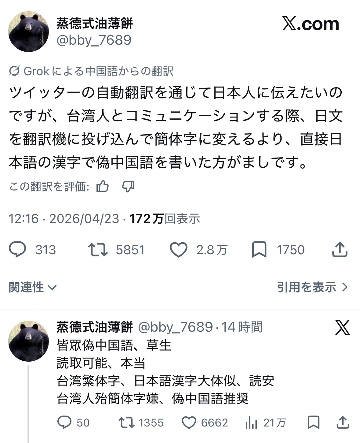 | … | 2426/04/24(金)14:07:50No.1423324395そうだねx4我完全中国語理解完全台湾語理解 |