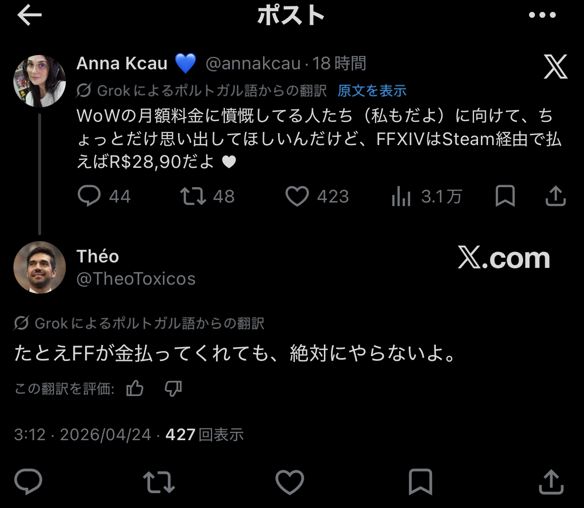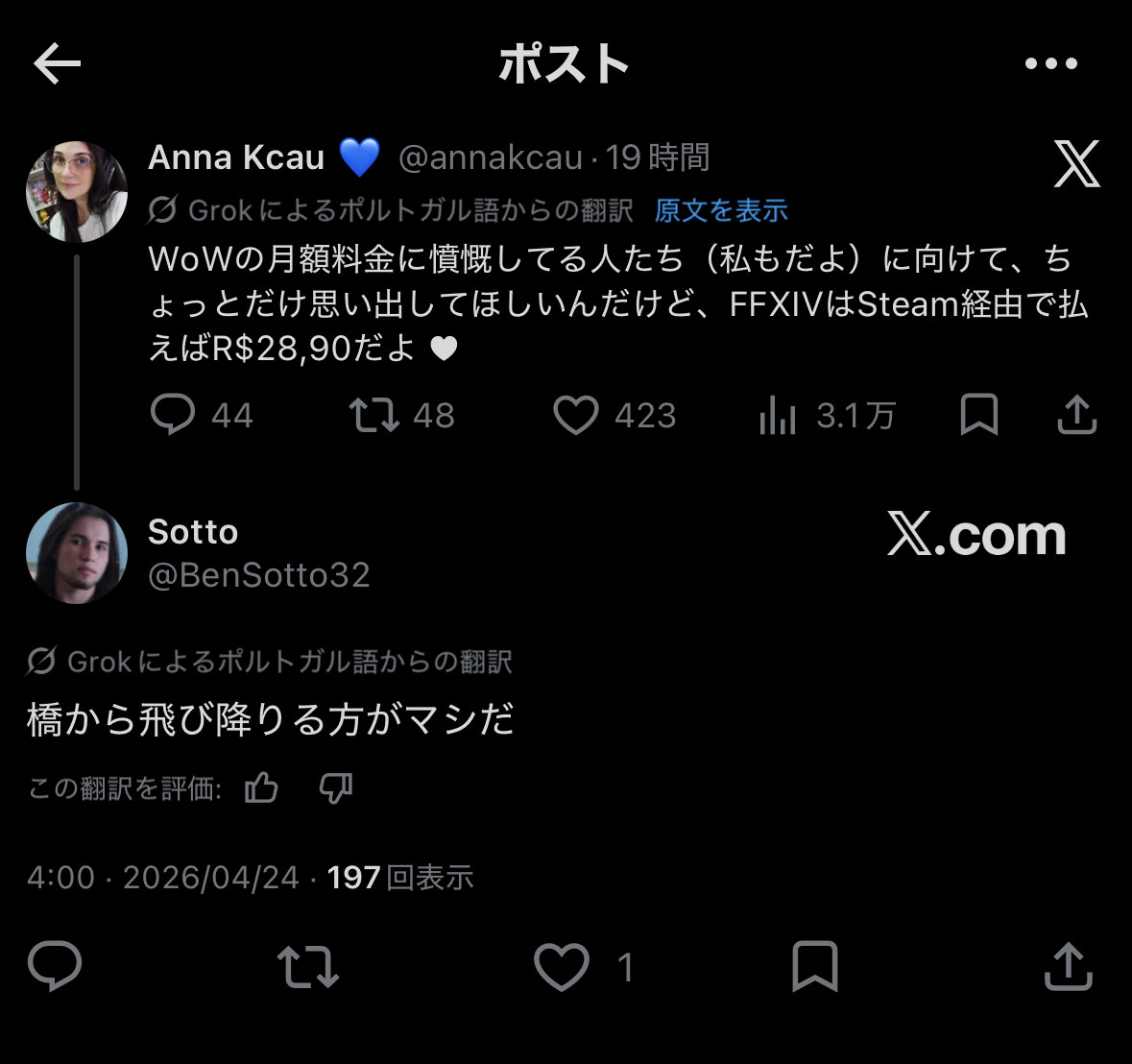 | … | 1626/04/24(金)22:51:00No.1423487320+>https://egg.5ch.io/test/read.cgi/ffo/1776983157/163 |