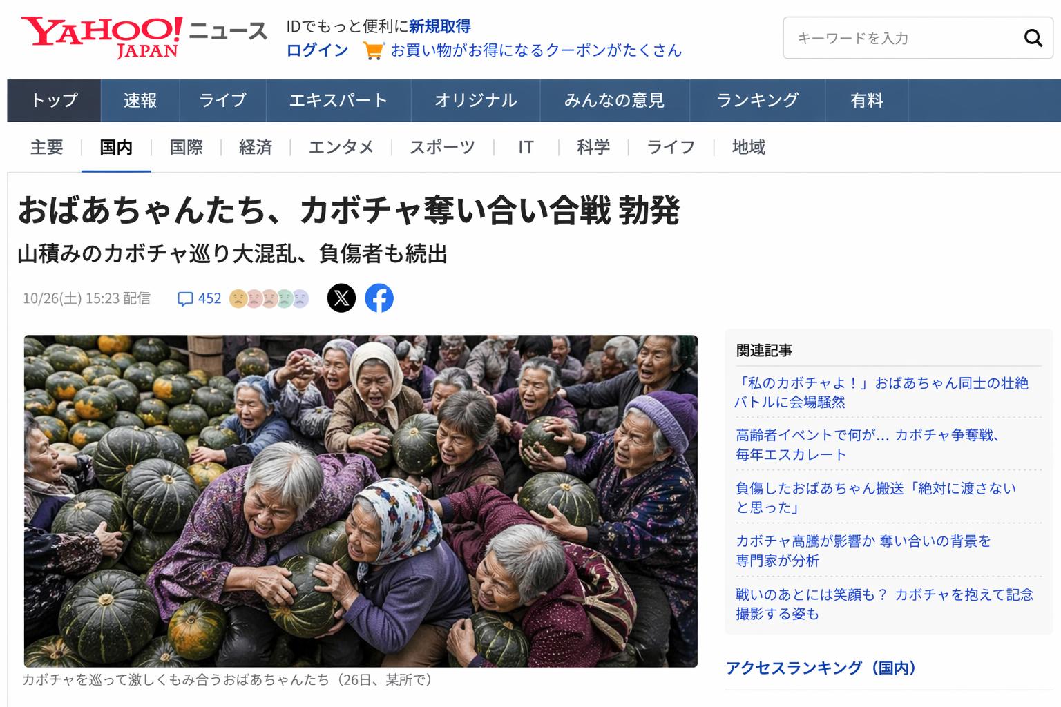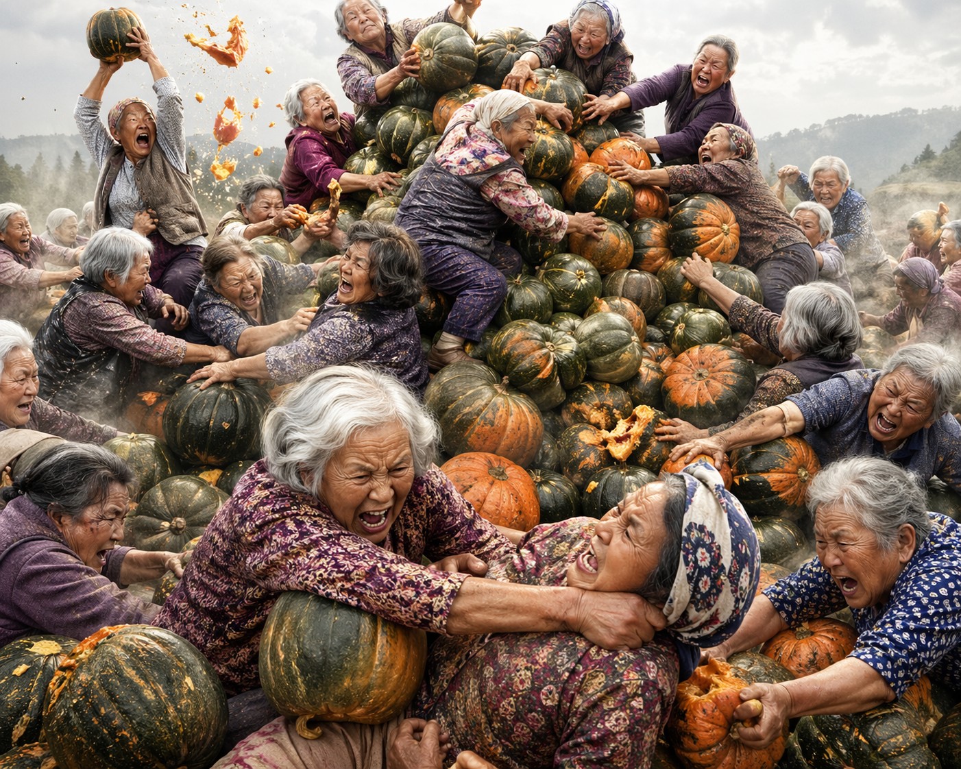 | … | 126/04/24(金)22:50:50No.1423487262そうだねx25おばあちゃんによるカボチャ奪い合い合戦。おばあちゃんの群れが山のように積まれたカボチャをバイオレンスにアグレッシブに奪い合う。 |