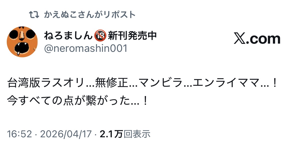 | … | 826/04/25(土)08:20:08No.1423569980+>エンライの無修正グロマンがやってくることが予測されてる台湾版 |