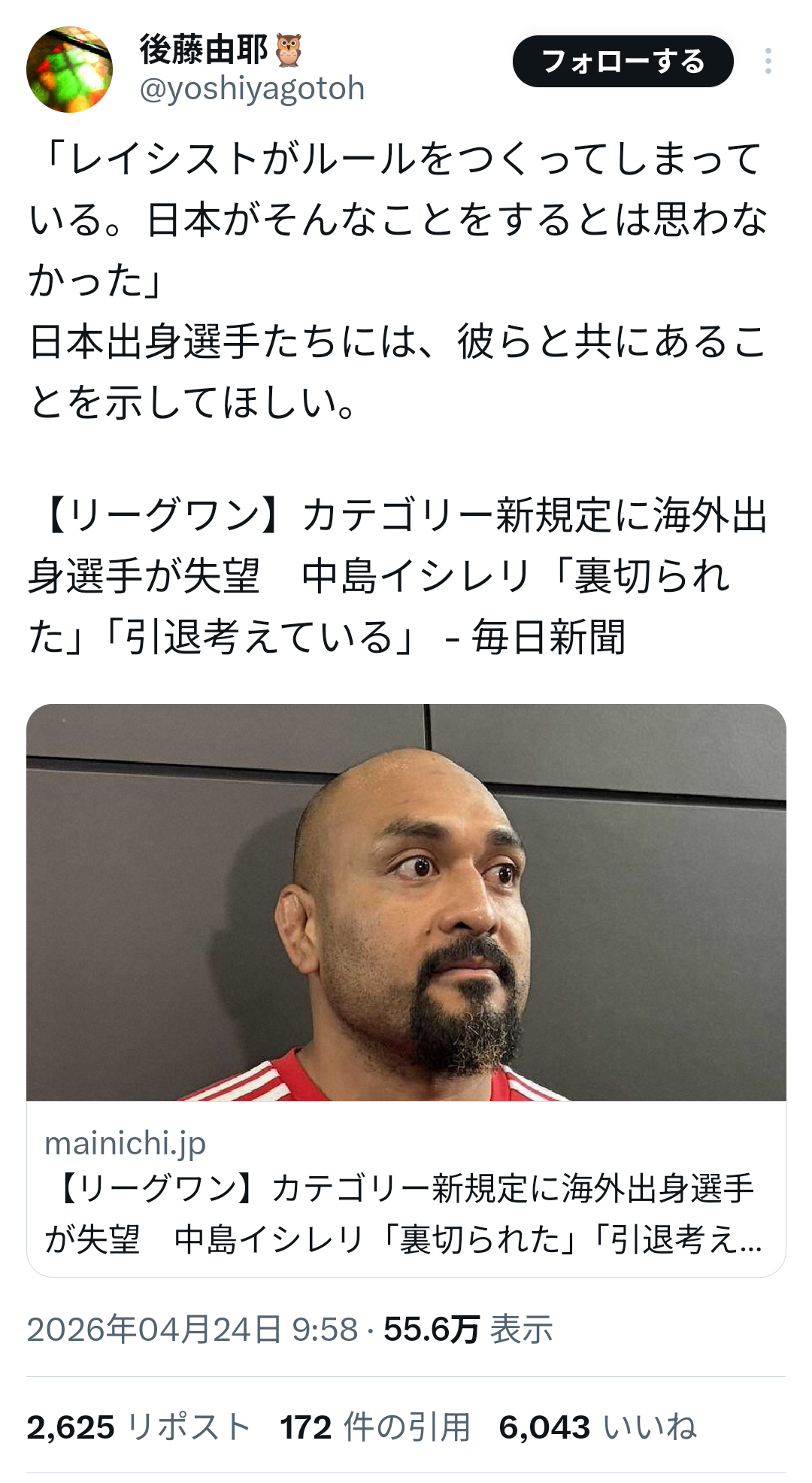 | … | 2526/04/25(土)15:39:00No.1423670592そうだねx8国内選手育てるって部分制限無くすとスポーツ廃れるからな… |