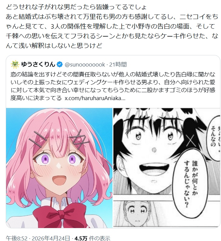 | … | 4526/04/25(土)15:52:39No.1423674247+右も途中まで好感の持てるラブコメ主人公扱いだったからな… |