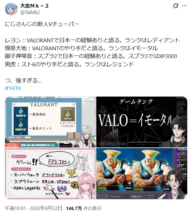 | … | 5026/04/25(土)19:59:16No.1423749350そうだねx4>にじさんじのほうがライバーも社員も多いのに大会少ないよね |