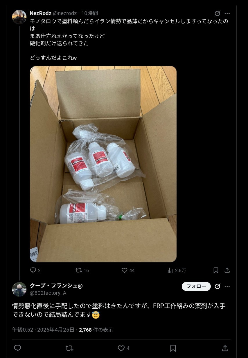 | … | 10226/04/26(日)00:24:03No.1423852774+イランが短期で収束する見込みだったら話も別だったんだろうけどそれが望めなくなればなるほど企業も買いだめに走ることになるだろうからなぁ… |