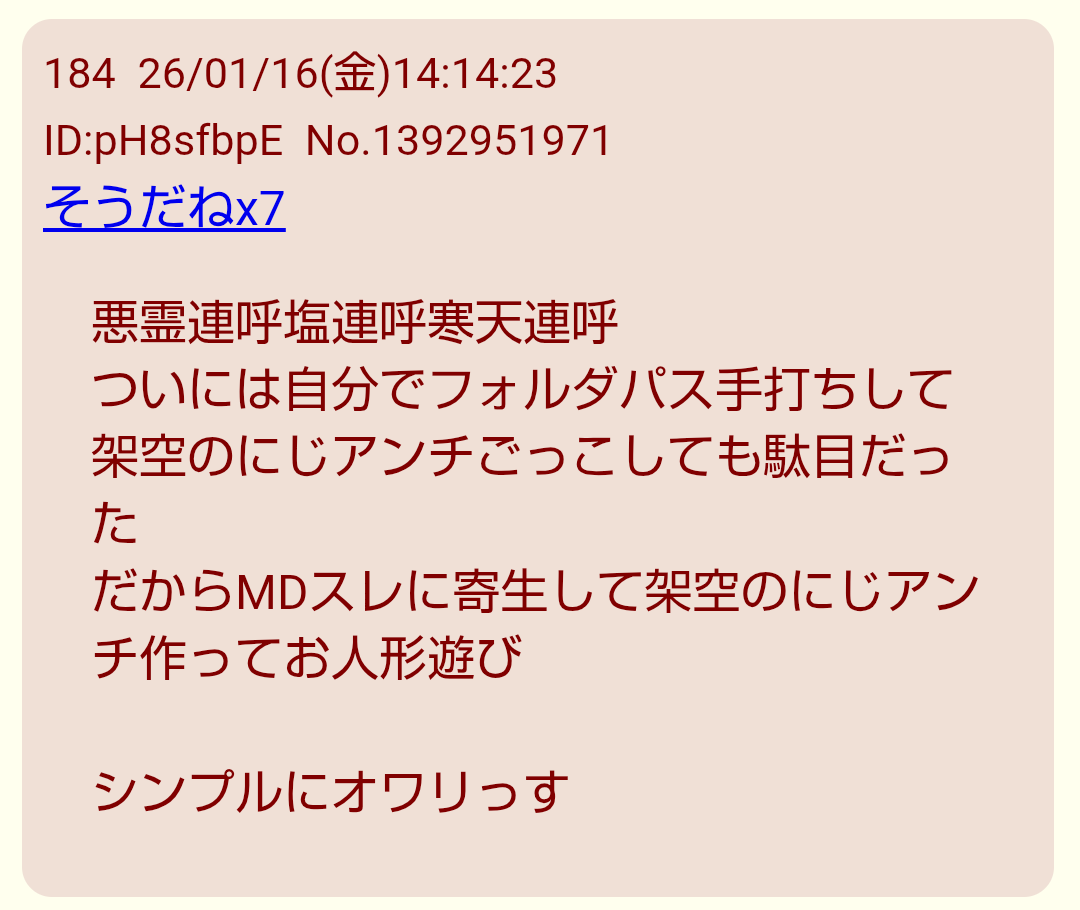 | … | 7026/04/25(土)23:44:51No.1423839272そうだねx2>少数でエコーチェンバーしてる粘着スレですらあれは成りすましだって主張しだして切り捨てようとしてると聞いてダメだった |