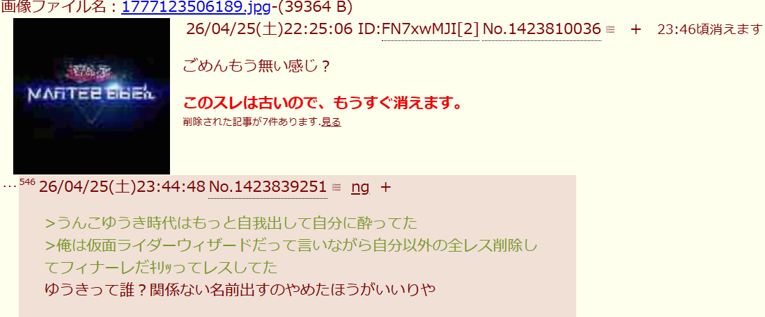 | … | 4326/04/25(土)23:40:34No.1423837781そうだねx2>不破師範に負けた雑魚 |