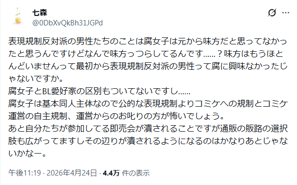 | … | 2926/04/26(日)01:08:35No.1423865211そうだねx4公的な表現規制がコミケの規制と関係ないと思ってるのがよくわからない |