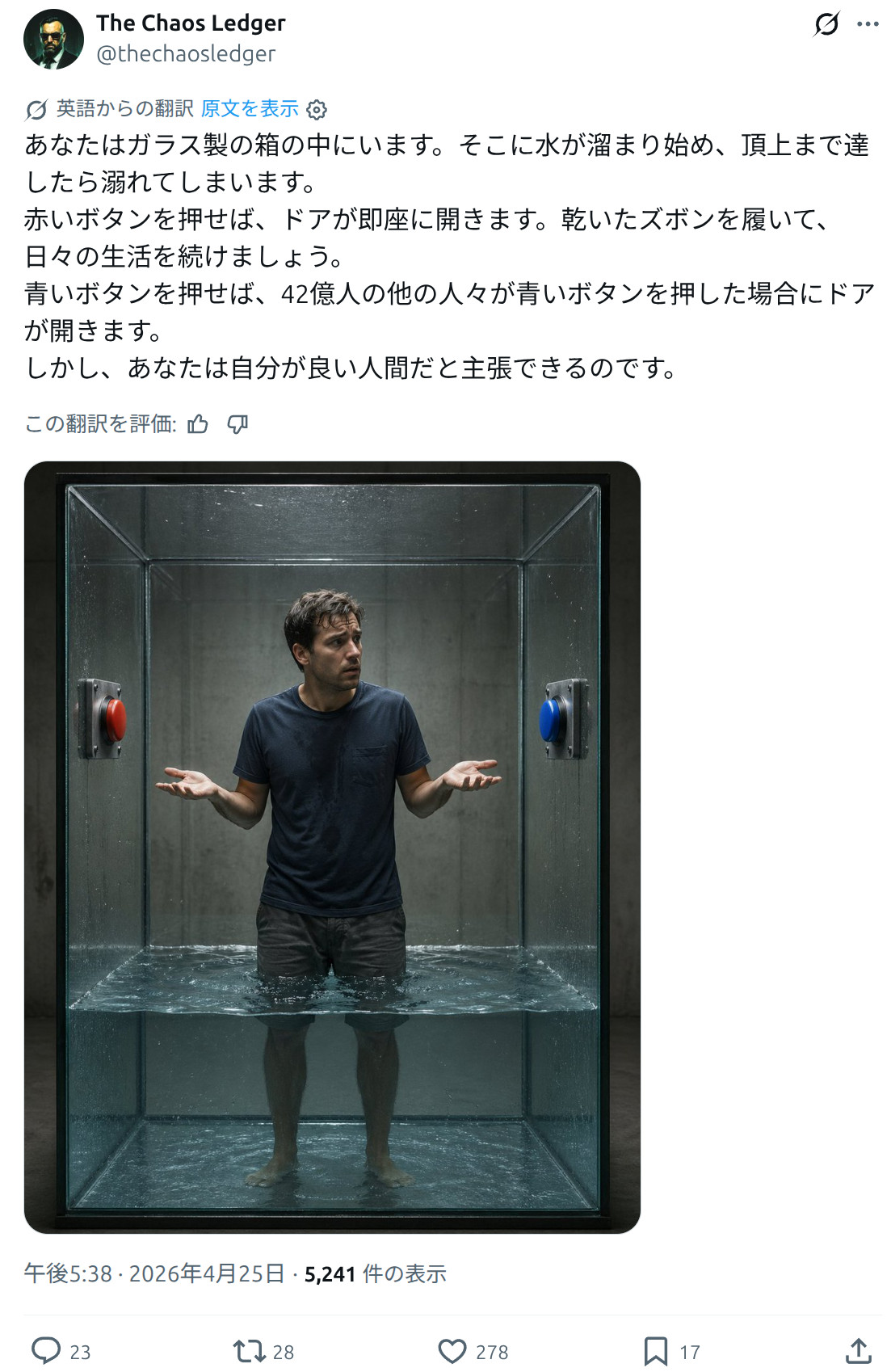 | … | 126/04/26(日)01:14:11No.1423866968そうだねx148全員が赤いボタン押せば誰がリスク負うこともなくない? |