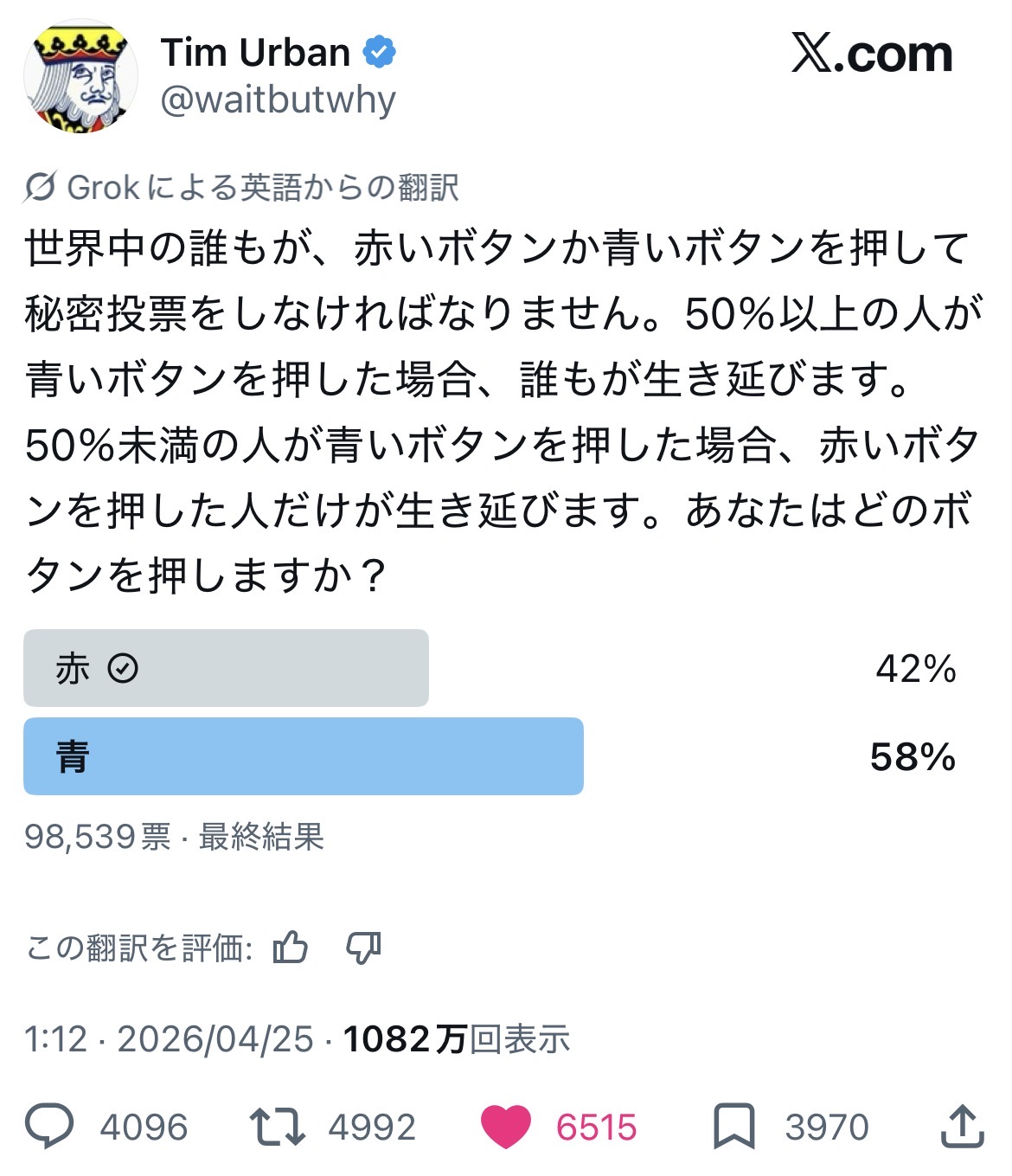 | … | 83726/04/26(日)05:05:31No.1423894433+>Everyone in the world has to take a private vote by pressing a red or blue button. If more than 50% of people press the blue button, everyone survives. If less than 50% of people press the blue button, only people who pressed the red button survive. Which button would you press? |