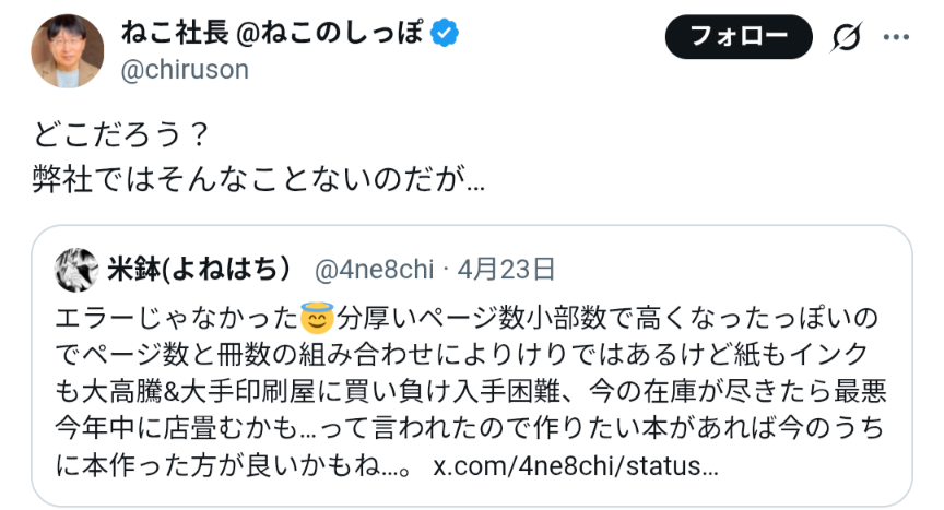 | … | 5726/04/26(日)03:50:45No.1423890641そうだねx2マジで不足してる時って値上げする前に刷れませんって言われるんだよね |