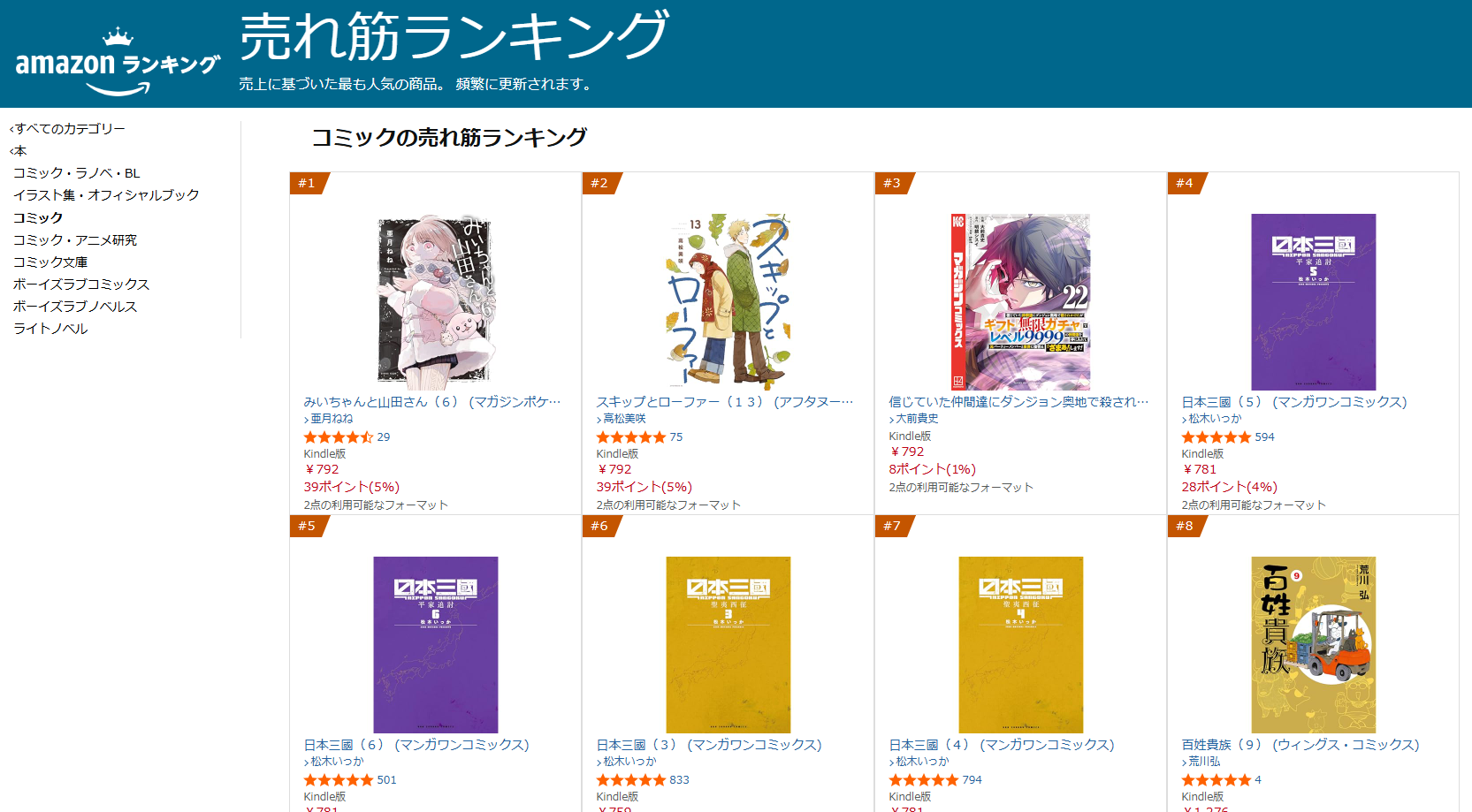 | … | 1226/04/26(日)08:29:58No.1423908699そうだねx1みい山スキローと新刊が上位のなか日本三國はアニメ効果かな |