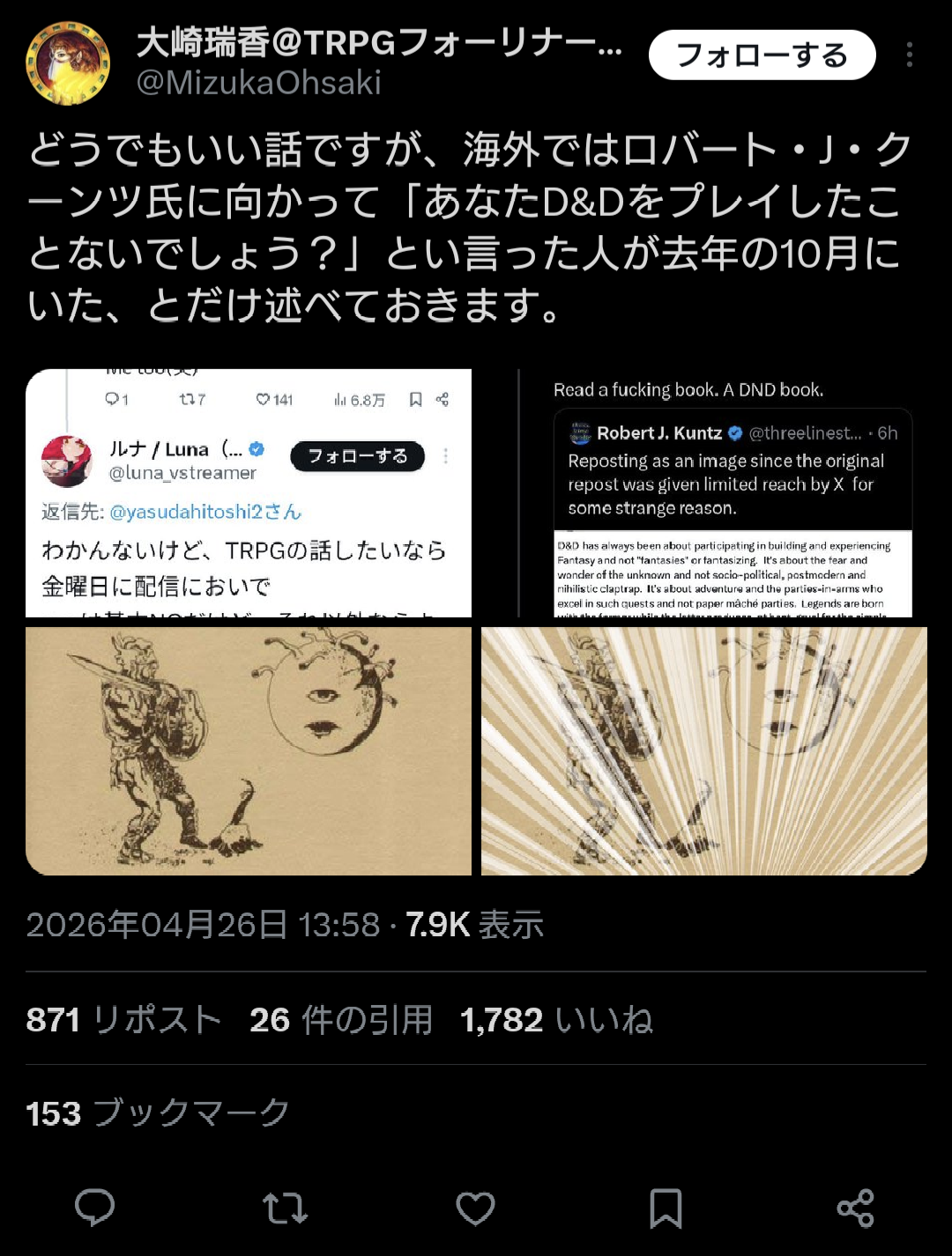| … | 21426/04/26(日)20:54:23No.1424136378+>「TRPGをやっているのに安田均に暴言を吐いた!死ぬべき!」みたいな温度感の人が多くてコワ〜⋯ってなった |
