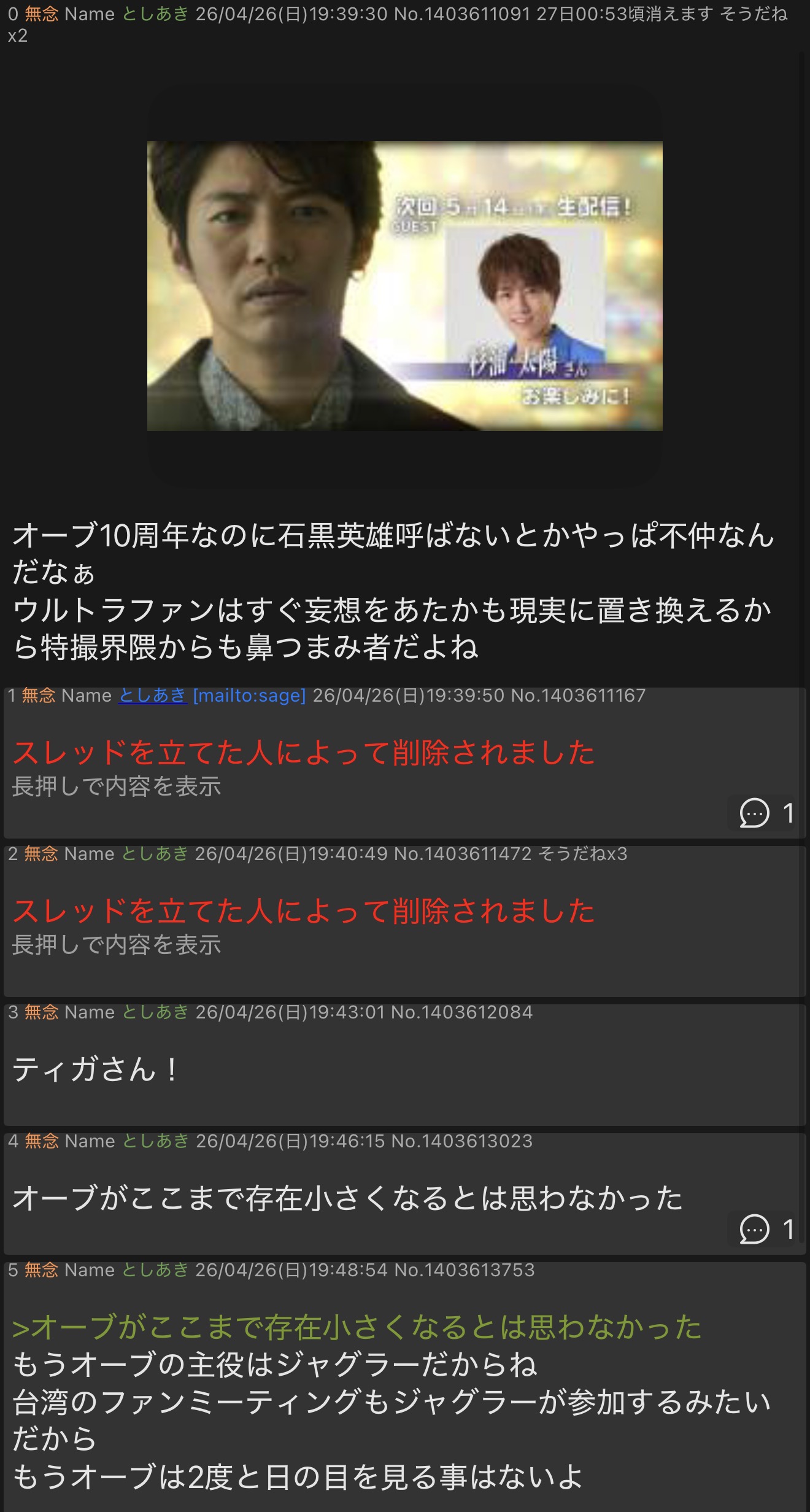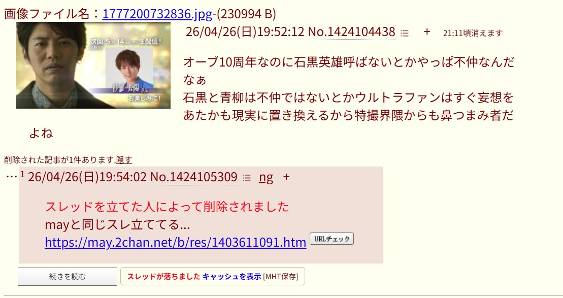 | … | 826/04/26(日)20:15:53No.1424116377+書き込みをした人によって削除されました |