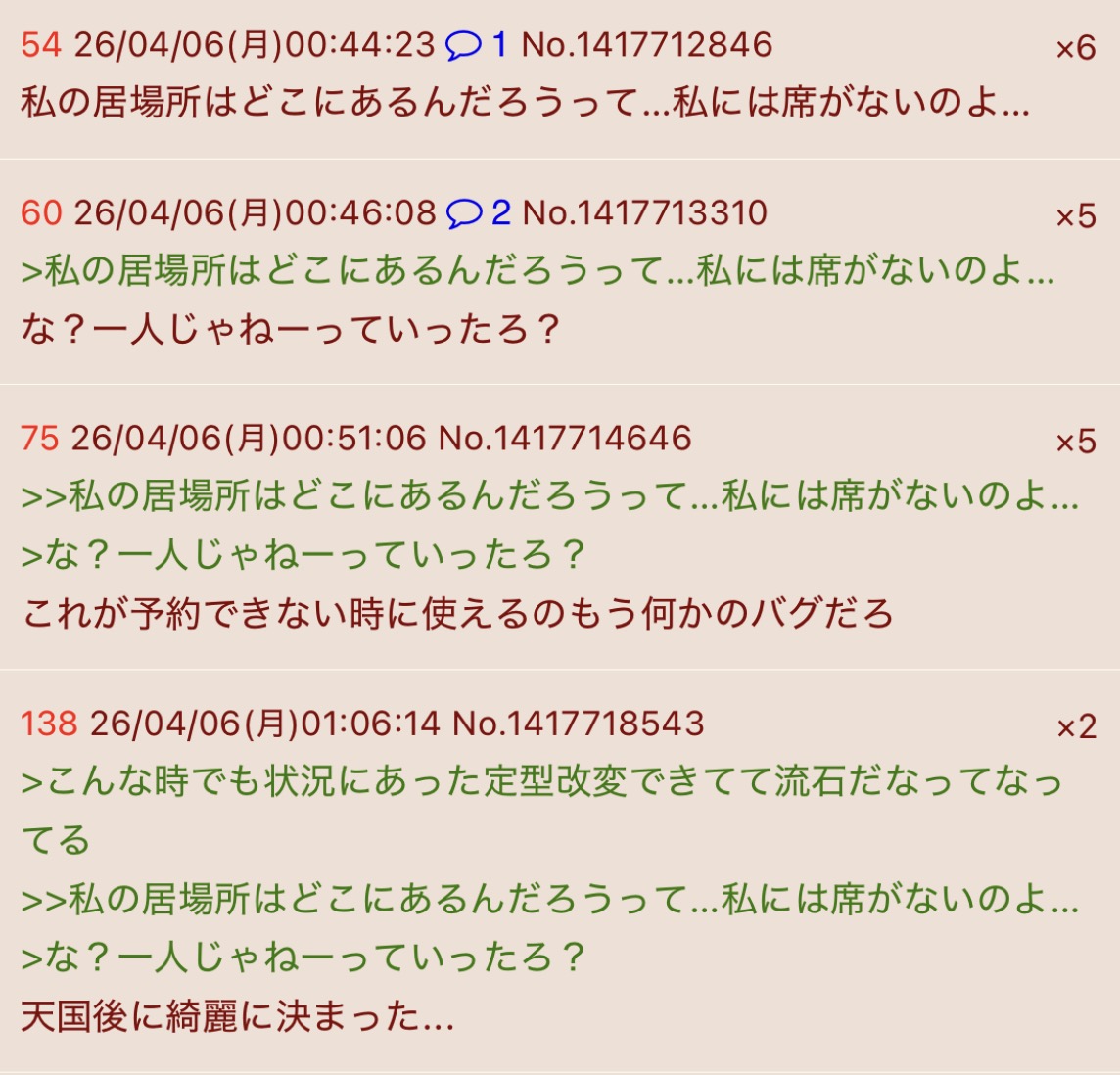 | … | 1726/04/27(月)00:18:17No.1424217979+2時間くらいトイレいって戻ってきた |