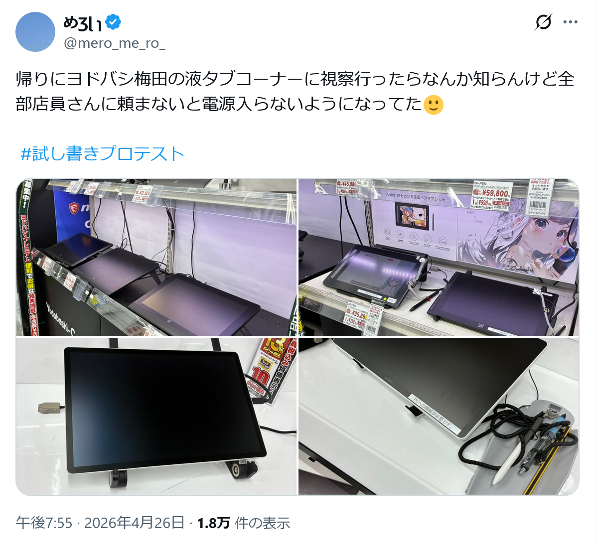 | … | 7026/04/27(月)10:03:10No.1424275120+>落書きおじさんは電源入れてくださいってお願いするだろたぶん 店側がプロテストをどうお断りするかだな |