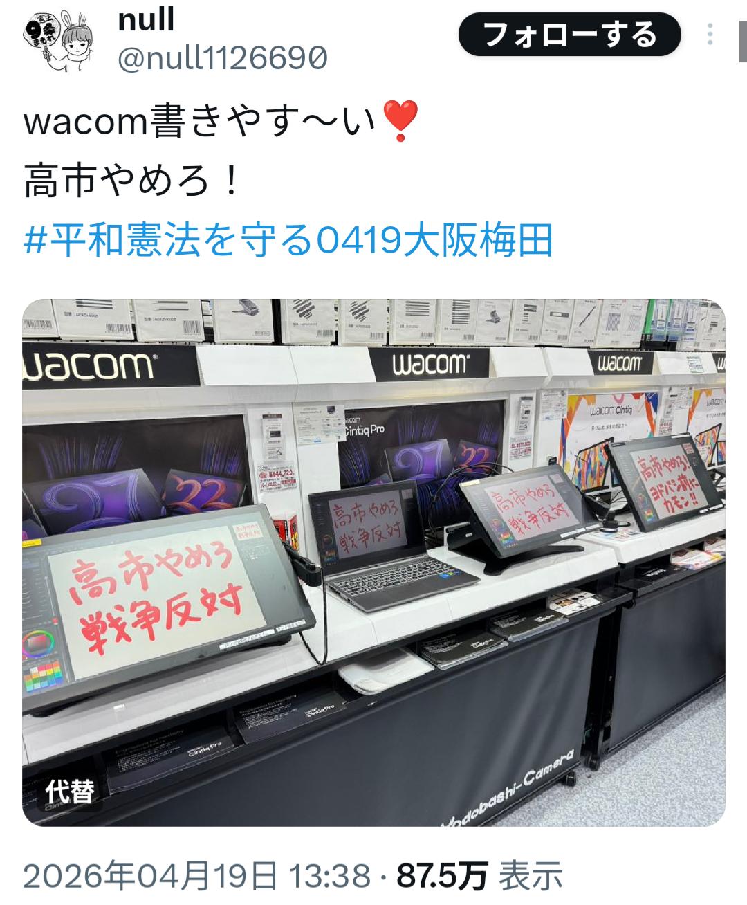 | … | 5426/04/27(月)10:00:36No.1424274771そうだねx16>戦争反対してるだけなのが迷惑…? 他人の物を規約外の政治活動に使っても許されるってんなら何されても文句言えんぞ |