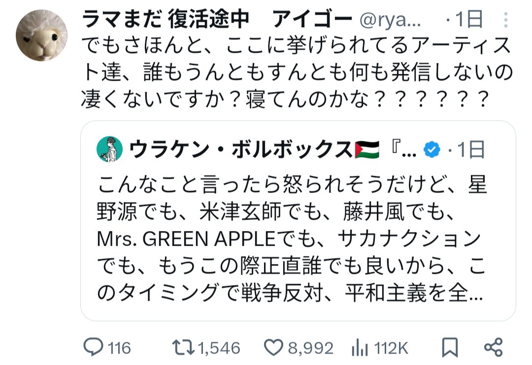 | … | 4626/04/27(月)09:59:25No.1424274614そうだねx1>>星野源とか空気読んで反戦ソング歌えやって燃やされそうになってるぞ今 >意味不明すぎる⋯ 反戦の意思を示さないのは現政府を認めることだから戦争賛成と思われても仕方ないからな |
