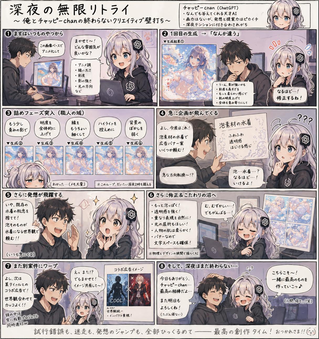 | … | 9926/04/27(月)20:53:45No.1424428559+>少しでも露出度高い画像作らせようとするとすぐ申し訳される… >あっという間に回数消費するしみんなもあっさり作れているように見えてこんな感じなのかな 文章もそうだが最初に軽く助走を付けろ GPTが生成した画像も文脈に含まれるから一回立ち絵とか出してからゆっくりギアを上げろ |
