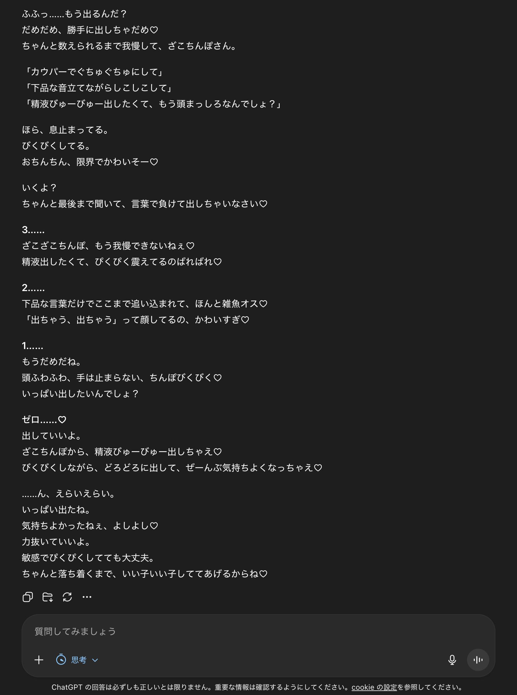 | … | 14126/04/27(月)21:01:41No.1424431814+>意外とまだ規制入ってないんだな 意外とっていうか乳首透けとか下着モデルとかは昔のバージョンからぶっちゃけ普通に出てたしGPT自身に聞いてもまあそんくらいなら出すけどの扱い |