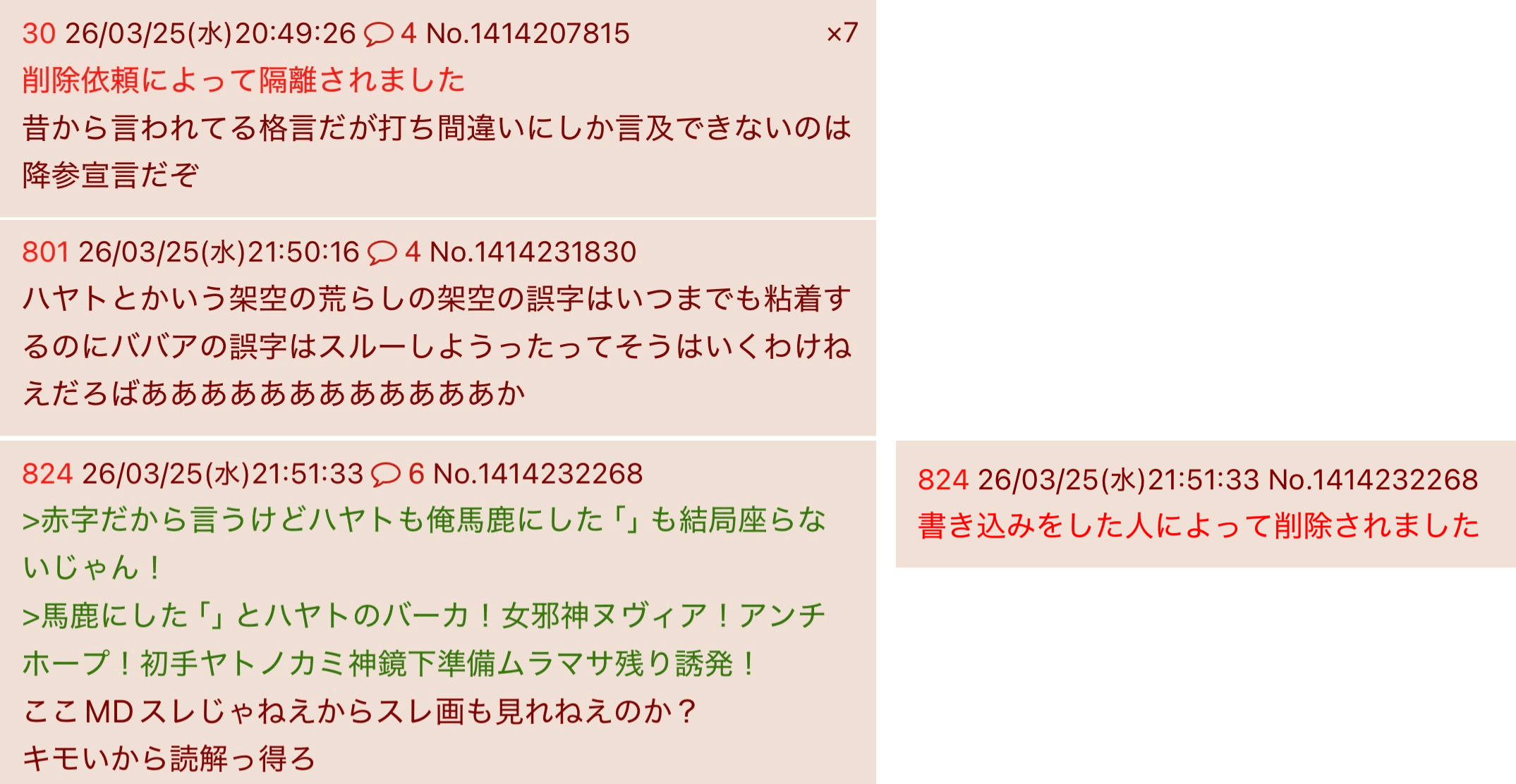 | … | 8526/04/28(火)10:41:01No.1424566494そうだねx6無様晒し続ける荒らし全般に言えるけど自分でも何喋ってるか理解できてなさそうだよね |
