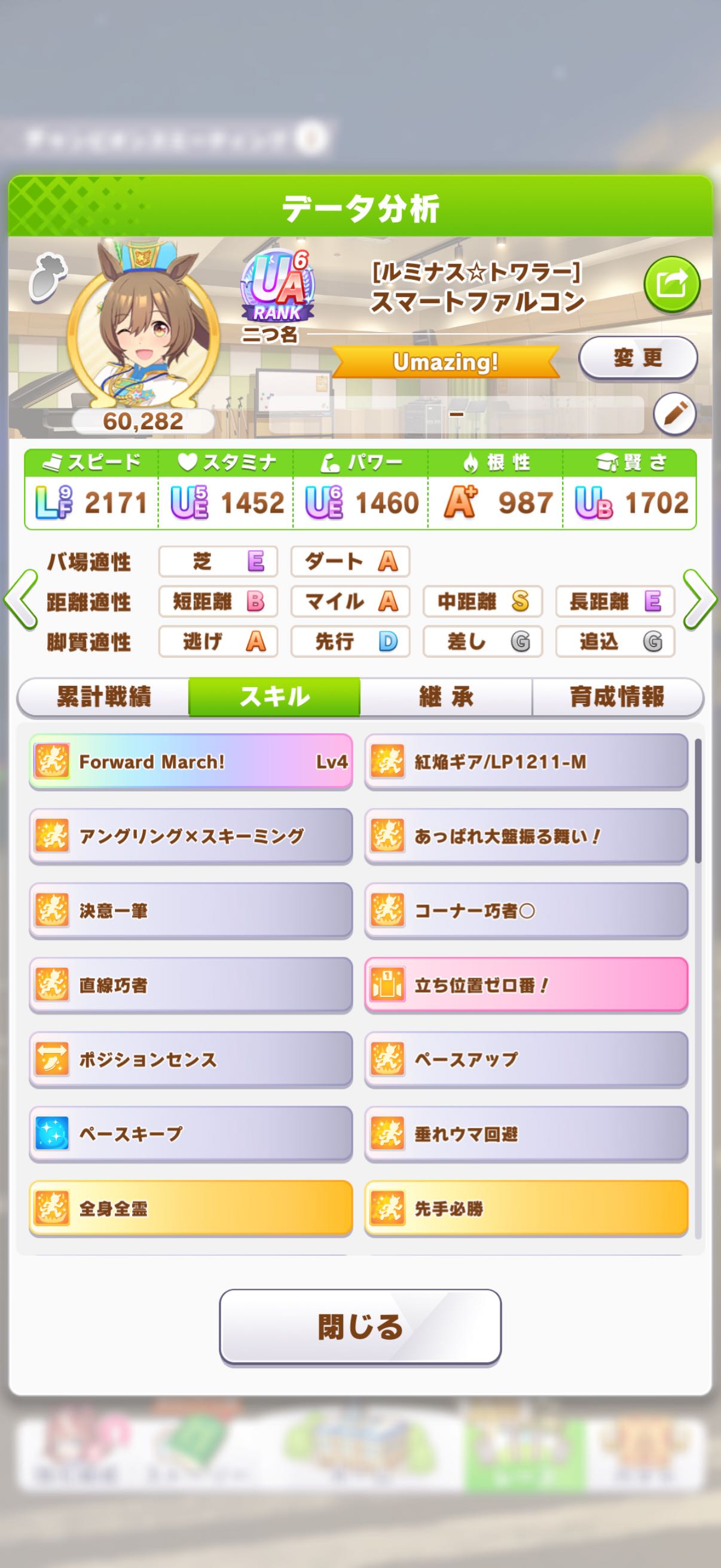 | … | 58926/04/28(火)13:37:27No.1424609300+>今回試しに覚醒6スペ使ってたけど勝率15%あったのでワンチャン掴む力はあると思うのだ >というか覚醒7になったらこれやべーんじゃねと思ってるのだ 賢さの仕様変更で金スキルの数が強さの直結するから 覚醒金3つはフツーに強い気するのだ |