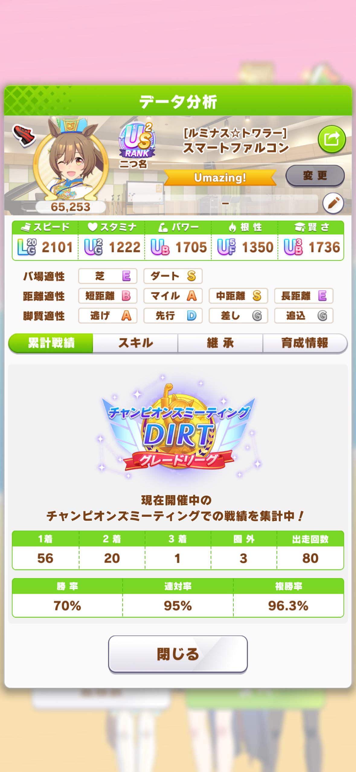 | … | 6426/04/28(火)12:14:08No.1424584981+>スタミナ編成でプラチナなのだ… >イリテツなんか信じなくてよかったのだ… ウインディちゃんも因子揃えるのも面倒だったしスタシャカ頼みでやったけど結論根性そんなにガチ盛りしなくて問題なかったのだ |