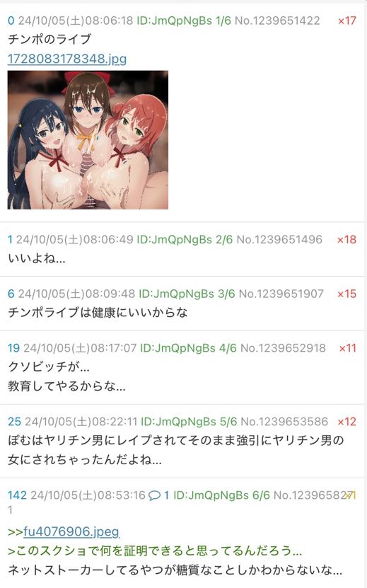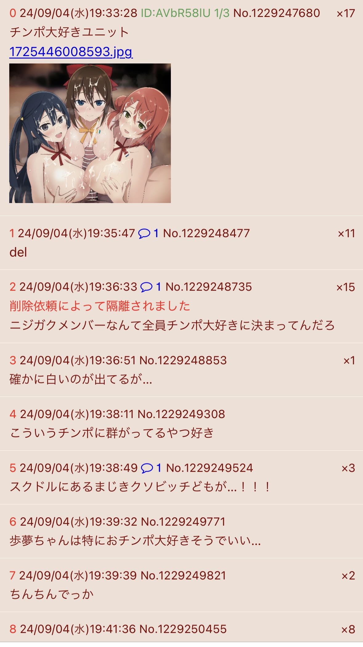 | … | 526/04/28(火)14:54:02No.1424627170+スクールアイドルなんてみんな雑魚マンコだよ |