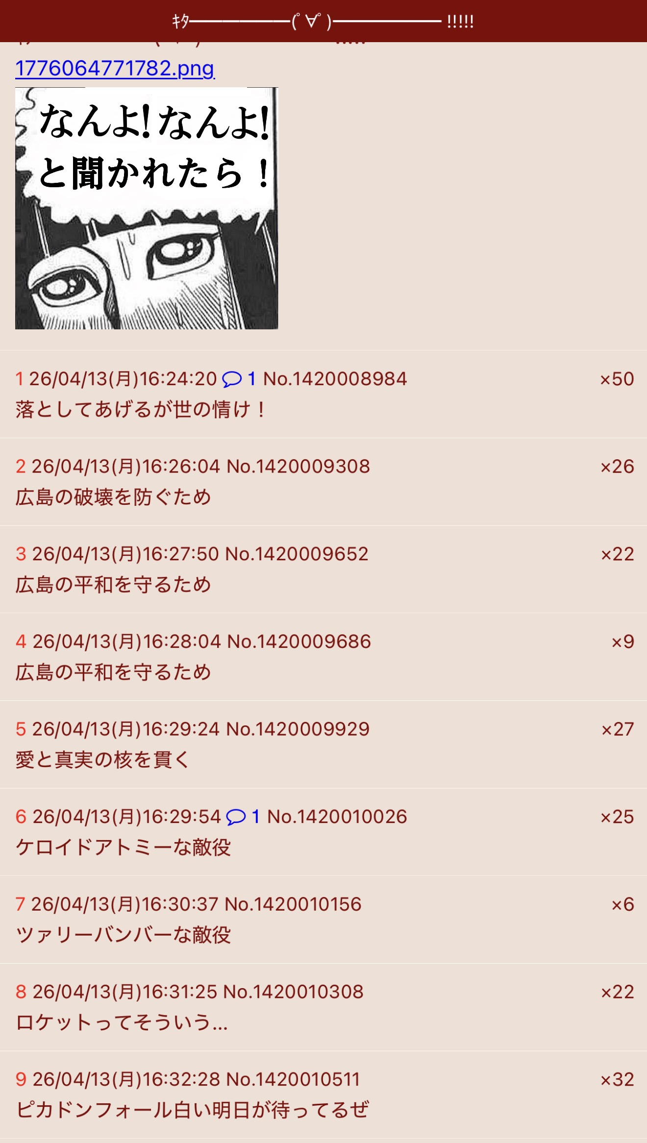 | … | 8326/04/28(火)15:49:00No.1424640023+カープ関連がはだしのゲンか別の作品かわからない |