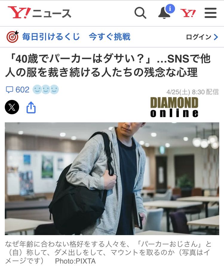 | … | 126/04/28(火)14:59:05No.1424628309そうだねx3>この「パーカーおじさん」をめぐる議論では、特に年齢とスタイルの関係が問題として取り上げられていました。要するに、パーカーやロゴ付きTシャツなどのカジュアルな服を、年配の人が着ることに対する不満や不安というものが、あるようなのです。 |