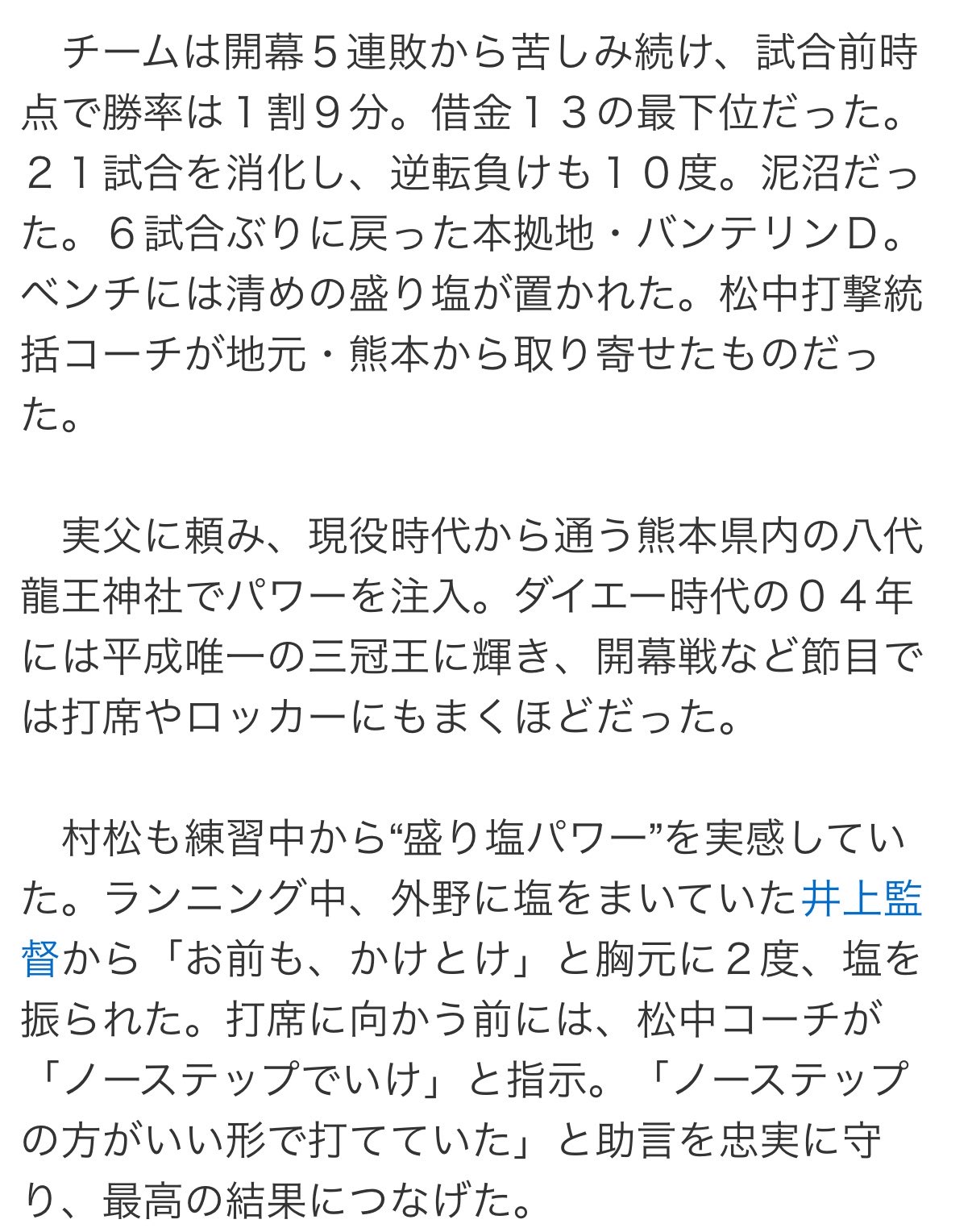 | … | 2226/04/28(火)20:48:56No.1424727959そうだねx1>前日27日の練習時には盛り塩が片付けられており、ベンチ付近には設置されていなかった。「盛り塩ないやん!」と気づいた松中コーチは、ベンチ裏から塩を持ってきて、丁寧に3カ所へ設置した。 |
