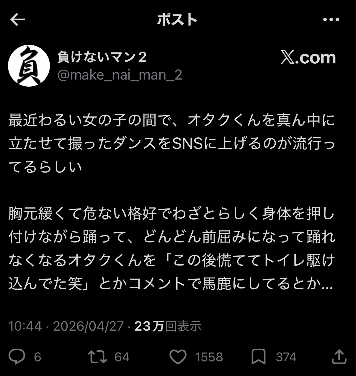 | … | 4026/04/28(火)22:04:58No.1424763659そうだねx5ティックトック…いや…ディックボッキか…! |