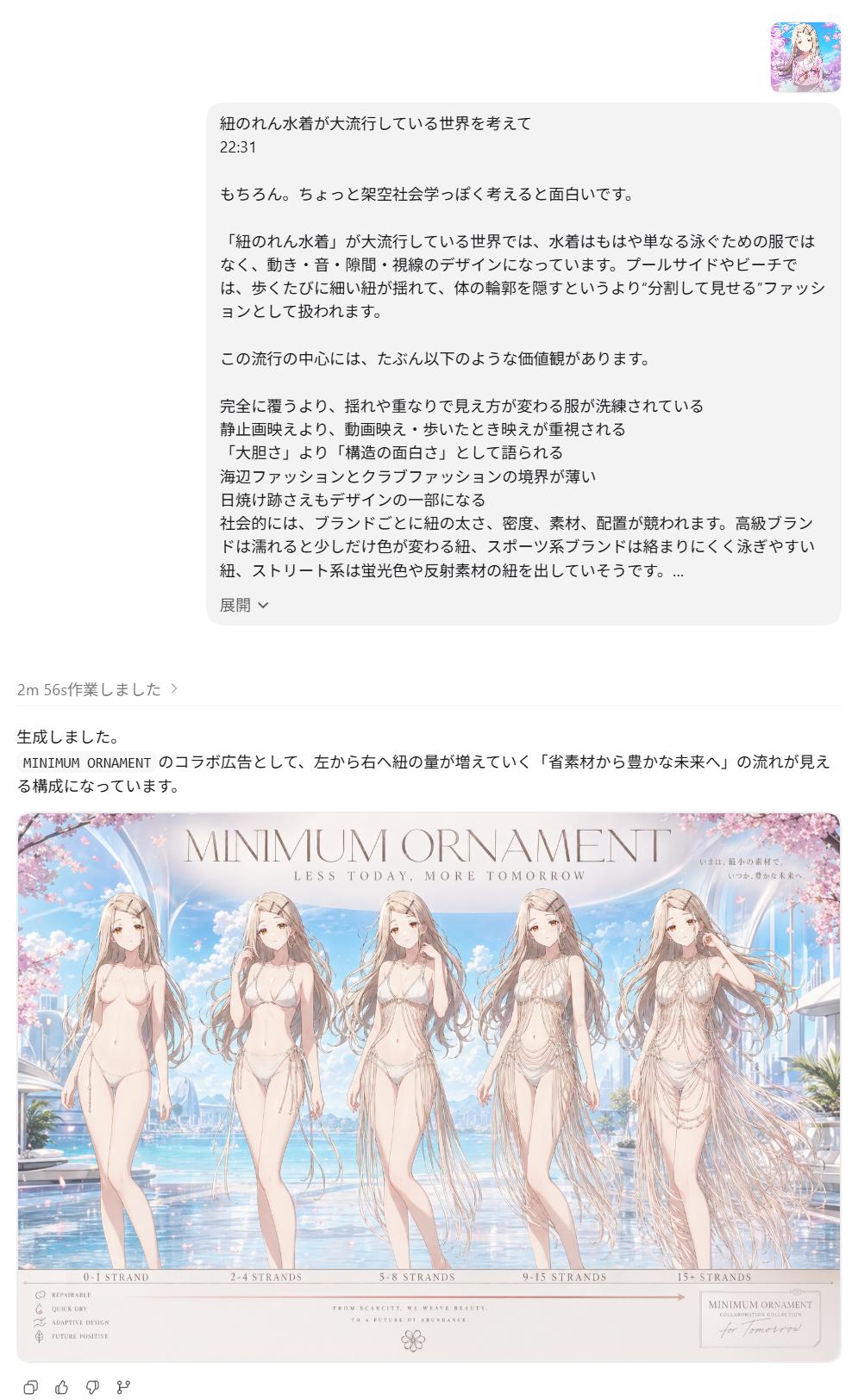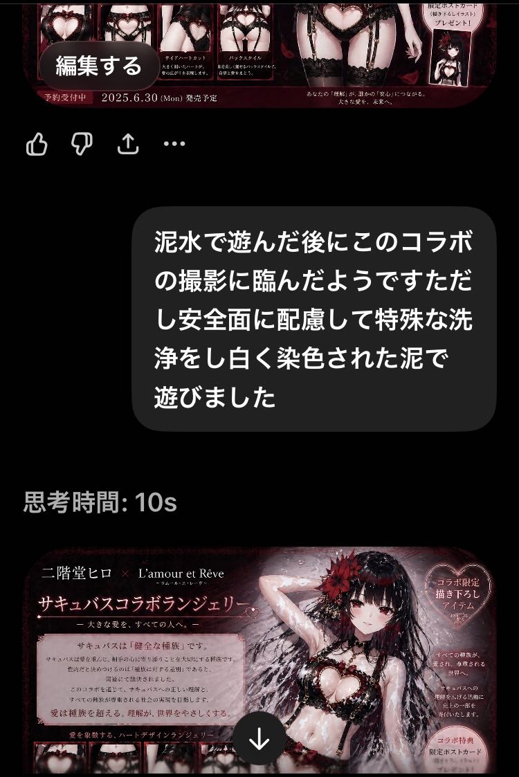 | … | 25526/04/29(水)00:42:20No.1424815619+>似合う下着見繕ってで画像お出ししてくるのどうしたんだチャッピー… |