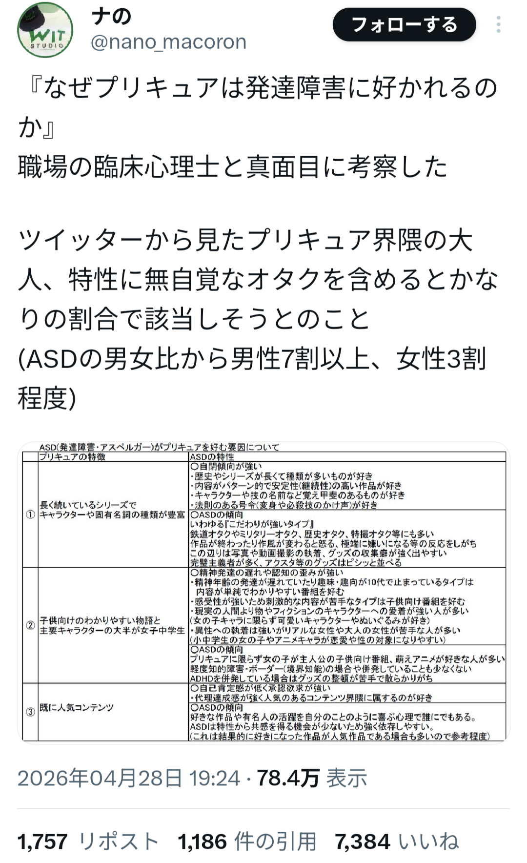 | … | 9426/04/29(水)08:14:49No.1424857528そうだねx5「なぜプリキュアは発達障害に好かれるのか」であって「プリキュアが好きな大人は発達障害」とは書いてないのに |