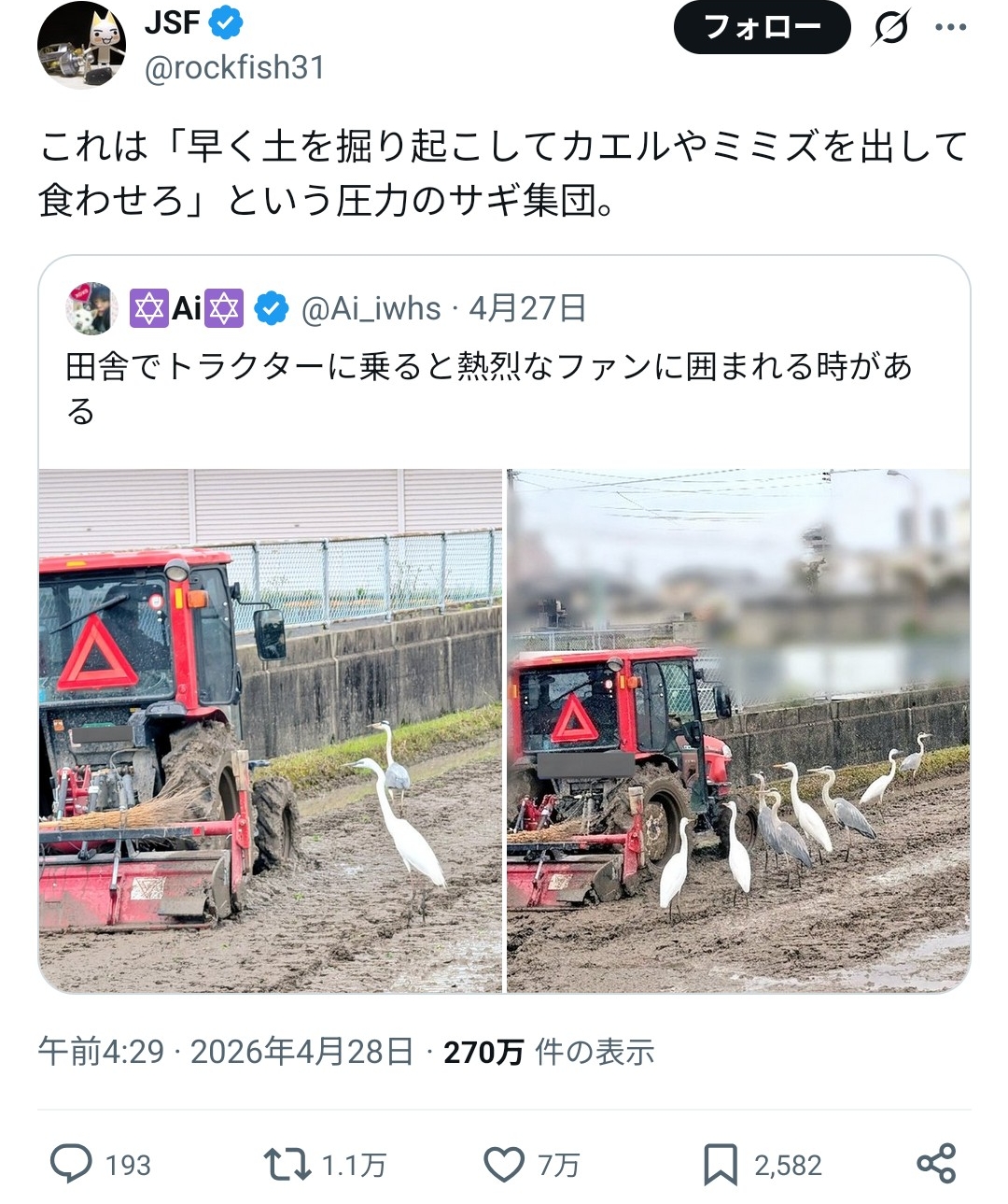 | … | 9126/04/30(木)09:19:10No.1425202851+この季節のお楽しみはトラクターの後に行列するサギと |