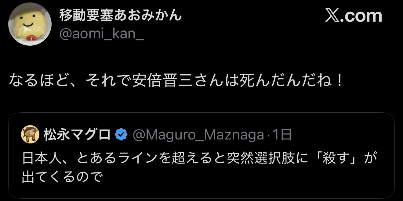 | … | 8226/05/01(金)00:18:46No.1425464727+こんなところで言うのもなんだけど罵倒語として死ねと殺すぞが気軽に出てくるのは世界的に珍しい方 |