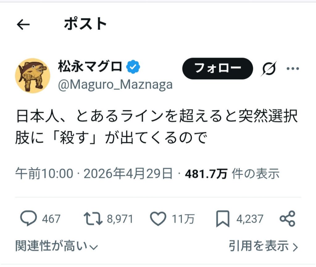 | … | 3026/05/01(金)00:01:16No.1425459295そうだねx6ライン超えたら殺すしかなくなるだけで |